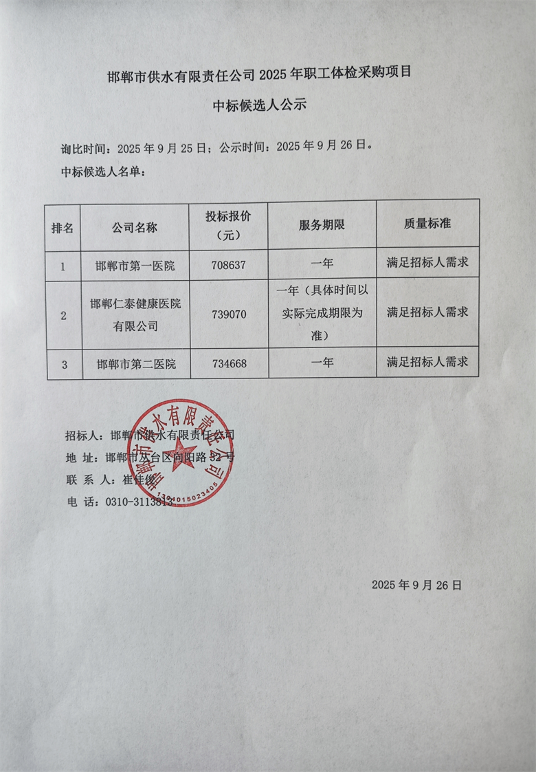 邯郸市供水有限责任公司2025年职工体检采购项目中标候选人公示