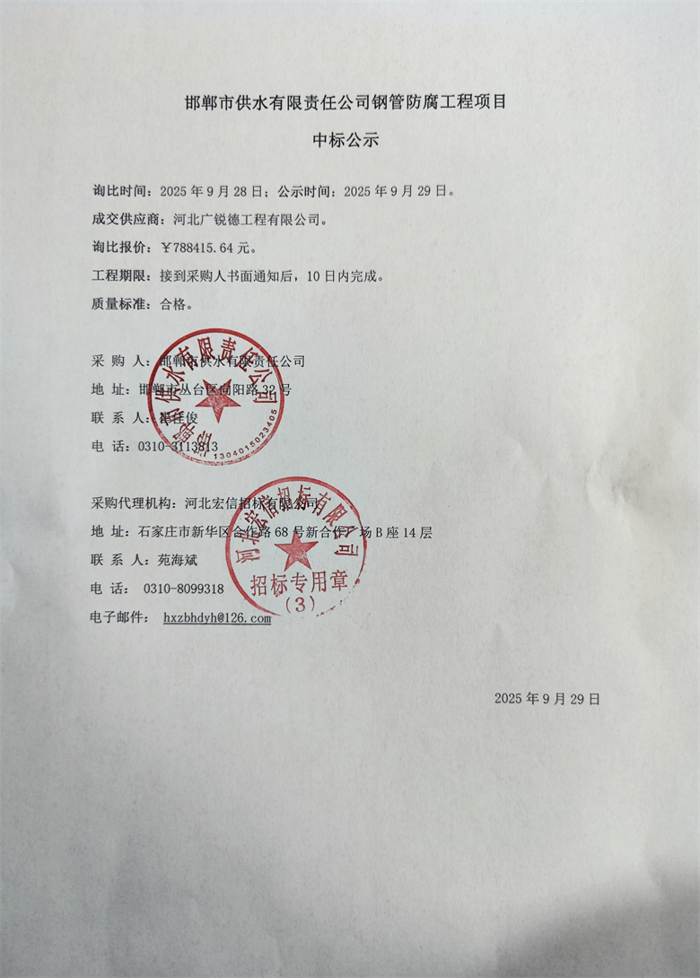 邯郸市供水有限责任公司钢管防腐工程项目中标公示